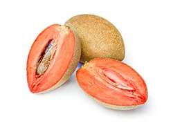 A rare and uniquely attractive first-generation hybrid, intended for high-end tropical cultivation and high-quality commercial production. A vigorous, evergreen tree 8 to 12 meters tall, with a dense, rounded crown and dark green, leathery leaves that appear light coppery-gold on new growth. Light brown, less fissured bark exudes a light milky sap when cut. This variety is suited to tropical and subtropical climates, tolerating temperatures as low as -2°C. It requires full sun. It prefers deep, well-drained soil and is tolerant of sandy and loamy soils. The ideal pH should be between 6.0 and 7.0, and water stagnation should be avoided. It is recommended to plant 5 to 6 meters apart. The small, white, fragrant flowers appear in late spring on old wood. The oval to round fruits weigh 0.7 to 1.8 kg, with a smooth, golden skin and a buttery, golden-orange flesh with a rich, sweet flavor that combines flavors of mango and pumpkin. The tree begins fruiting 3 to 4 years after planting and produces consistent annual production once established. The variety has good resistance to moderate drought, heat, and wind, while being relatively sensitive to extreme cold and standing water.